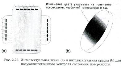 Сенсоры в виде поверхностного покрытия известны уже достаточно давно. Например, покрытия, изменяющие цвет под действием внешнего воздействия. Обычно такие покрытия и аналогичные им ткани не позволяют получить точной количественной информации. Однако часто требуется лишь качественная информация о достижении контролируемым параметром порогового значения, а в некоторых случаях соответствующий анализ качественных характеристик может дать количественный результат. В инженерном смысле пленки и нити являются плохими датчиками, но именно так биологические системы получают всю информацию, кроме визуальной и акустической.