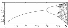 Бифуркационная диаграмма для данного отображения имеет вид: