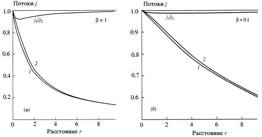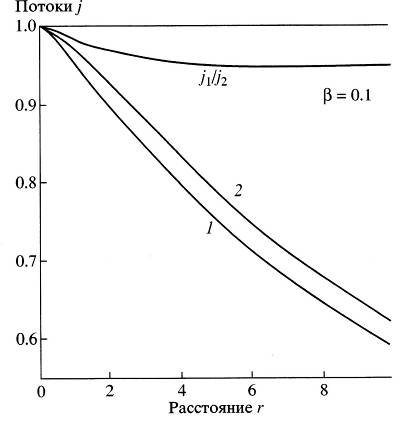 = 0.1. Потоки вблизи поверхности частицы нормированы на 1, расстояния измерены в длинах свободного пробега. Кривая 1: