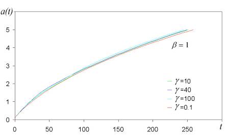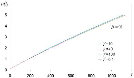 Рис. 10 . Размер частицы a(t), найденный из уравнений (2.41) и (3.59). Масса и плотность налетающих частиц взяты равными единице.