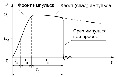 Итак, полное время разряда в промежутке tр складывается из времени нарастания приложенного напряжения до начального для данного промежутка – холостого времени tх , статистического времени запаздывания tс и времени формирования разряда tф . При этом время разряда, подобно его составляющим, является величиной случайной, зависящей от многих факторов и имеющей существенный статистический разброс. Пробой промежутка будет происходить в том случае, если его время разряда при воздействии импульса напряжения с определенной амплитудой окажется не меньше длины импульса. При этом будет наблюдаться срез импульса в малой окрестности времени tр (см. рисунок 1). В противном случае разряд в промежутке не произойдёт.