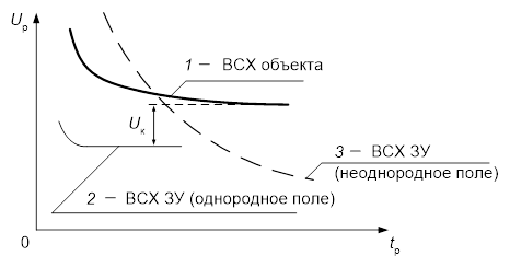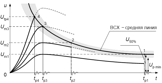 При воздействии импульсов с относительно небольшой амплитудой разряды происходят на хвосте волны. При этом координаты точек ВСХ определяются амплитудой приложенного импульса и временем разряда (см. рисунок 3, точки 1, 2, 3). Максимальное время разряда соответствует минимальной амплитуде импульса, ещё достаточной для разряда в промежутке, которая и принимается равной минимальному разрядному напряжению Upmin . С увеличением амплитуды импульса время разряда уменьшается. При разрядах на фронте волны точки ВСХ строятся по величине напряжения, достигнутого к моменту разряда (см. рисунок 3, точка 4).
