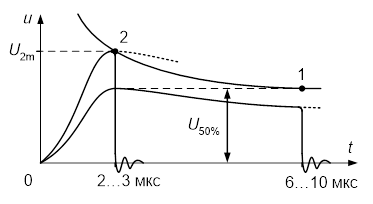 Одна из характерных величин ВСХ называется пятидесятипроцентным разрядным напряжением, равным амплитуде такого стандартного грозового импульса, при многократном воздействии которого разряд наблюдается в 50% всех случаев. Это напряжение практически равно минимальному разрядному напряжению и соответствует горизонтальному участку вольт-секундной характеристики промежутка и времени разряда порядка 6…10 мкс (рисунок 6). Оно является мерой импульсной прочности изоляции при воздействии на нее полных (не срезанных) стандартных импульсов напряжения. Отношение 50%-ного разрядного напряжения к амплитуде разрядного напряжения при длительном воздействии (например, при постоянном напряжении или напряжении промышленной частоты) называется коэффициентом импульса. Для промежутков с однородным электрическим полем коэффициент импульса равен единице. Для промежутков с неоднородным полем коэффициент импульса практически всегда больше единицы.