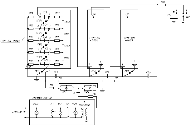 Схема ГИН-1500 с представлением внутреннего соединения элементов аппарата АИИ-70 и одного из ГИН-500 приведена на рисунке 7. В схеме приняты следующие обозначения: АТ – регулировочный автотрансформатор; Т – высоковольтный трансформатор; VD1, VD2 и С1– полупроводниковые вентили и конденсатор схемы удвоения; С1э и С2э – экранные ёмкости; R1 и R2 – водяные сопротивления, выполняющие одновременно роль защитных, зарядных и делительных для второго и третьего ГИН-500; R3 и R4 – защитные водяные сопротивления; ЗР1–ЗР3 – запальные разрядники с регулируемым расстоянием между шарами; 1ПР1–1ПР2 – промежуточные разрядники первого ГИН-500; 1С1–1С5 = 0,02 мкФ – основные конденсаторы первого ГИН-500; RФ = 11,6 кОм – фронтовое сопротивление; 1R1–1R5 = 48 кОм, 1R6–1R10 = 12 кОм, 1R11–1R14 = 24 кОм – зарядные сопротивления первого ГИН-500; ИО – испытуемый объект; ШР – шаровой разрядник.