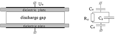 Безэлектродный (емкостной) импульсно-периодический разряд (ЕИР) относится к сравнительно хорошо изученным объемным импульсным разрядам, широко используемым в импульсных газовых лазерах. Отличительной особенностью ЕИР является то, что электроды, на которые подается импульсное напряжение, изолированы от разрядного промежутка пластинами диэлектрика (Рисунок 2). Этот необычный тип разряда исследовался теоретически и экспериментально в связи с применениями в СО2-лазерах[3]. Чтобы лучше понять процессы в разряде, рассмотрим простую модель.