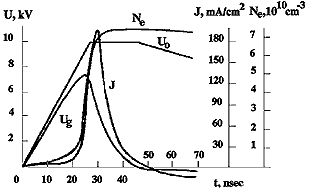 На практике условие малости длительности фронта нарастания напряжения по отношению к характерному времени ионизации, определяемому величиной максимального значения приложенного напряжения U0P, обычно не выполняется, поскольку U0P, как правило, больше, чем требуется. Реальное электрическое поле в плазме из-за эффекта поляризации начинает снижаться до того, как приложенное к электродам напряжение достигнет максимального значения. Максимальная величина, до которой поднимается электрическое поле в плазме, зависит от скорости нарастания напряжения. Таким образом, и величина Ti, и длительность импульса тока, и амплитуда импульса тока определяются скоростью нарастания напряжения. Для более эффективной ионизации следует использовать импульсы напряжения с более крутым фронтом нарастания. При этом генератор должен обеспечивать достаточно высокую импульсную мощность и выдавать импульс тока соответствующей амплитуды. Ограничения, связанные с характеристиками выходной цепи импульсного генератора, приводят к уменьшению достижимой плотности свободных электронов в разряде.