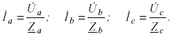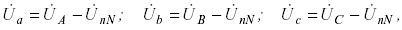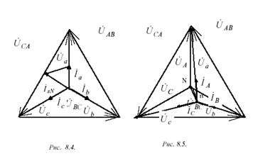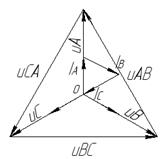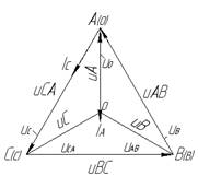 Токи IA , IB , IC в соответствующих линейных проводах называются линейными, токи, протекающие по фазам, фазным, а ток InN в нейтральном проводе называется нейтральным. Напряжения между линейными проводами потребителя UAB , UBC , UCA называются линейными, а между началом и концом фаз потребителя Ua ,Ub , Uc - фазными.