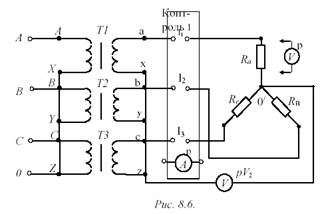 -три однофазных трансформатора Т1, Т2, Т3, соединенных в звезду и питающиеся от трехфазной сети (f=50 Гц, UЛ=220 В);