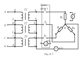 2.3 Собрать электрическую цепь по схеме, представленной на рисунке 8.7, для исследования трехфазной системы с нейтральным проводом (трехфазная четырехпроводная сеть).