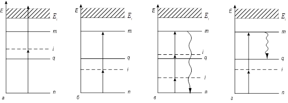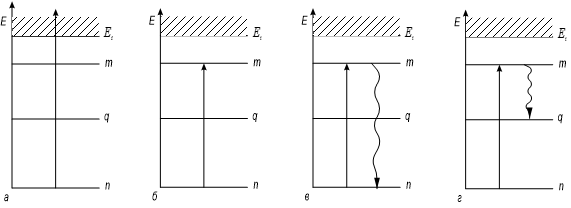 Рисунок.1. Схемы однофотонных процессов. a – фотоианизация атома, б - фотовозбуждение атома, в - рэлеевское рассеивание света атомом, г - романовское рассеивание света атомом. Е – энергия электрона в атоме, Еi – потенциал ионизации атома, n – основное состояние, m, q – возбужденные связанные состояния электрона в атоме, прямые стрелки - вынужденные переходы электрона в результате поглощения фотона, волнистые стрелки – свет, рассеянный атомами