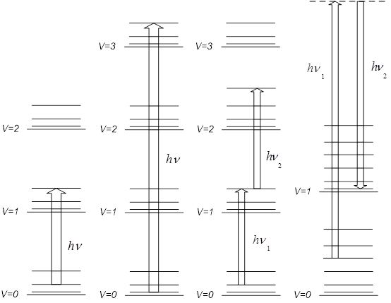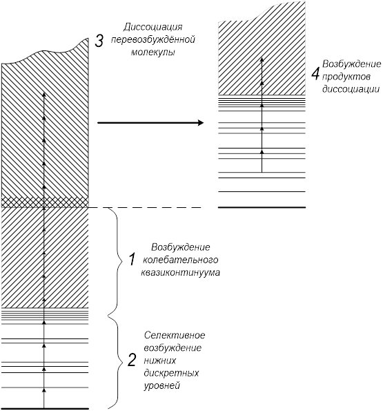 . Так как колебательный спектр молекул ангармоничен, то на первый взгляд кажется, что диссоциация может происходить только при очень большой интенсивности излучения, либо за счет нерезонансного многофотонного поглощения инфракрасного излучения, либо когда напряжённость поля столь высока, что ангармонизм колебательного спектра компенсируется штарковскими сдвигами и уширениями колебательных уровней. Оценки показывают, что в обоих случаях речь может идти о диссоциации при интенсивности инфракрасного излучения порядка 1012