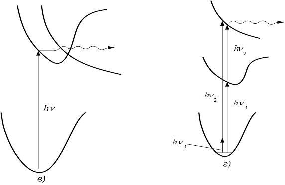 Рисунок.2. Схемы многофотонных процессов. a – многофотонная фотоианизация атома, б - многофотонное возбуждение атома, в – возбуждение высшей (третьей) гармоники падающего излучения, г – гиперрамановское рассеивание света атомом. Обозначения те же, что и на рис. I – состояние электрона, поглотившего один или несколько фотонов.