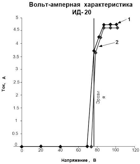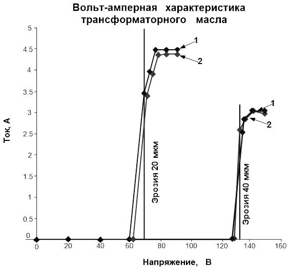 Проведена серия экспериментов для изучения вольт – амперной характеристики индустриального масла (ИД-20) от приложенного напряжения к электродам. Изменение мощности излучения не повлияло на электропроводность ИД-20.