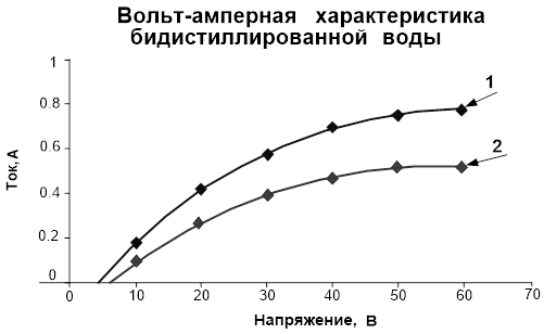 Рисунок.22. Зависимость вольт – амперной характеристики бидистиллированной воды от приложенного напряжения к электродам.