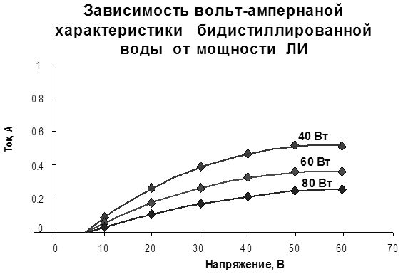 Зависимость вольт – амперной характеристики бидистиллированной воды от мощности ЛИ показана на рис.23. Экспериментально установлено, что увеличение мощности ЛИ приводит к уменьшению проводимости. Причиной ведущей к уменьшению проводимости, по всей видимости, следует считать испарение из межэлектродного зазора.