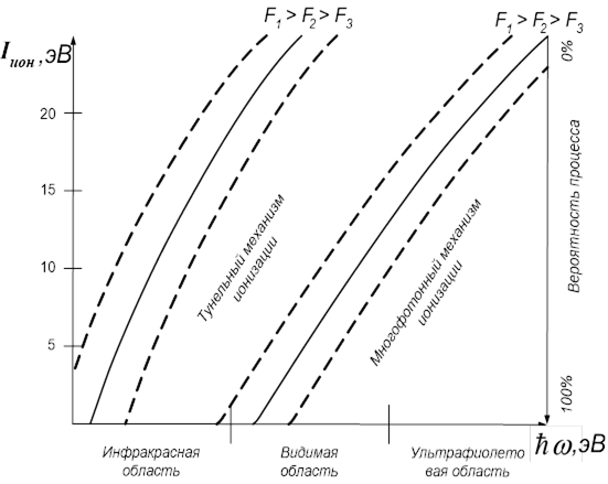 Возможные механизмы ионизации, зависимость их от интенсивности излучения(F), потенциала ионизации и частоты.