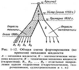 Общая схема формирования (во времени) механики жидкости, как видно из рисунка, в соответствии со всем сказанным выше, можно считать с некоторым приближением, что наука о механике жидкости (в современном представлении этого понятия) зародилась в трудах Архимеда.
