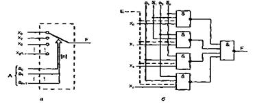 Входы мультиплексора делятся на две группы: информационные и адресующие. Работу мультиплексора можно упрощенно представить с помощью многопозиционного ключа. Для одноразрядного мультиплексора ого представлено на рис. 2.9, а. Адресующий код А задает переключателю определенное положение, соединяя с выходом F один из информационных входов X;.