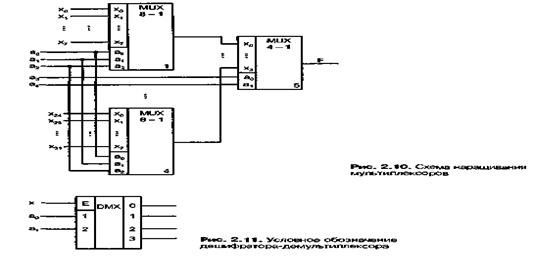 Наращивание размерности мультиплексоров возможно с помощью пирамидальной структуры из нескольких мультиплексоров. При этом первый ярус схемы представляет собою столбец, содержащий столько мультиплексоров сколько необходимо для получения нужного числа информационных входов. Все мультиплексоры столбца адресуются одним и тем же кодом, составленным из соответствующего числа младших разрядов общего адресного кода (если число информационных входов схемы равно 2П, то общее число адресных разрядов равно п. младшее поле ni адресного кода используется для адресации мультиплексоров первого яруса). Старшие разряды адресного кода, число которых равно п – п^ используются во втором ярусе, мультиплексор которого обеспечивает поочередную работу мультиплексоров первого яруса на общий выходной канал.