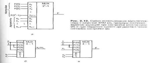 Полученному выражению отвечает соотношение между числом входов разного типа для мультиплексора. При этом на адресные входы следует подавать аргументы функции, а на информационные входы – сигналы настройки (рис. 2.12, я). Таким образом, для использования мультиплексора в качестве УЛМ следует изменить назначение его входов.