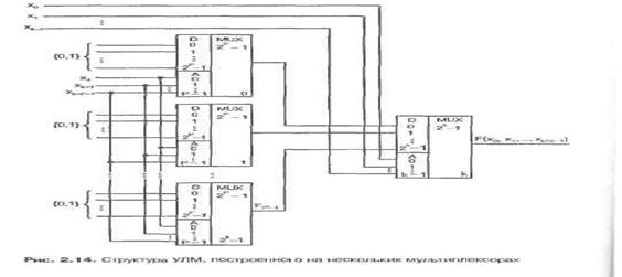 Дальнейшее расширение алфавита настройки за счет переноса трех и более переменных в сигналы настройки требует вычислений остаточных функций трех или более переменных. Вычисление таких остаточных функций с помощью мультиплексоров приводит к пирамидальной структуре (рис. 2.14), в которой мультиплексоры первого яруса реализуют остаточные функции, а мультиплексор второго яруса вырабатывает искомую функцию.