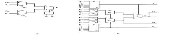 Рис. 2.13. Логический блок выработки сигналов настройки УЛМ с переносом, двух аргументов в сигналы настройки (а) и пример схемы воспроизведения функции четырех аргументов на мультиплексоре «4–1» (б)