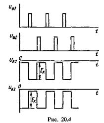 Отметим, что конденсатор С2 после опрокидывания схемы будет перезаряжаться и напряжение на нем к концу перезарядки станет равным иК2 ~ 0. При лавинообразном процессе напряжение на конденсаторах не изменяется. Таким образом, они представляют собой коротко замкнутые участки цепи, т.е. шунтируют резисторы Rt и R2. Поэтому скачки напряжения на коллекторе одного транзистора почти полностью прикладываются к базе другого транзистора. Если бы не было конденсаторов, часть напряжения скачков падала бы на резисторах Rt u.R2 и токи базы, коллектора, а соответственно, и скачки напряжения были бы меньше, а процесс – более длительным. На рис. 20.4, б показаны входные импульсы мвх1 и мвх2 и напряжения иК1 и иК2 на коллекторах транзисторов 7i и Т2. Амплитуда выходного импульса равна перепаду напряжения на коллекторе при переходе триггера из одного устойчивого состояния в другое. Когда транзистор открыт, напряжение на его коллекторе = 0; когда транзистор закрыт, иК1шкъ – Ек. Таким образом, амплитуда выходного импульса будет равна примерно Ек.