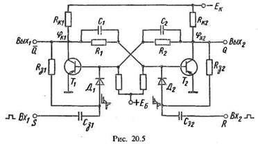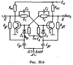 Раздельный запуск осуществляется подачей импульсов одной полярности поочередно на базы транзисторов (входы триггеров). Импульс, поданный на один из входов, устанавливает триггер в одно из устойчивых состояний. Импульс, подаваемый на другой вход, устанавливает триггер в противоположное устойчивое состояние. Схема триггера с раздельным запуском с подачей запускающих импульсов на базы через диоды показана на рис. 20.5.