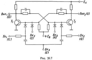 Были рассмотрены триггеры, имеющие один или два входа. Выпускают триггеры, имеющие три входа и более. Рассмотрим универсальный триггер, который называют JK‑триггером, одна из схем которого показана на рис. 20.7. Он имеет пять входов: J, К, R, S и С. JK‑триггер может работать как RS‑триггер (если на входы подавать поочередно положительные импульсы) и как Т-триггер (если вход J подсоединить к коллектору, транзистора Т» а вход К – к коллектору транзистора Т2). Таким образом, наличие входов J и К значительно расширяет возможности JK‑триггера.