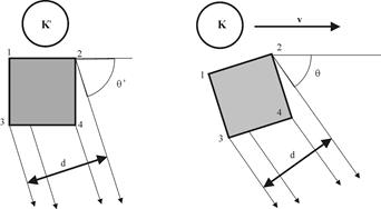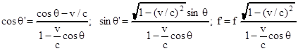 Угол qобразован двумя векторами: вектором скорости движущегося тела и вектором, направленным вдоль светового луча от движущегося источника к наблюдателю. Теоретически он может меняться от 0 до 180 градусов в системе отсчета K, связанной с наблюдателем. В системе отсчета, связанной с движущимся объектом, этот луч будет иметь другое направление, т.е. идти под другим углом. Обозначим этот угол как q'.