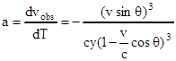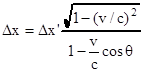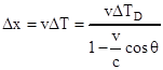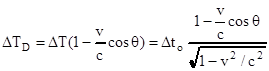 Введем угол θ, образованный двумя векторами: вектором скорости v, направленным вдоль оси x, и вектором направления световых лучей от движущегося объекта к наблюдателю. Благодаря эффекту Доплера наблюдаемый интервал между световыми вспышками будет также зависеть от угла наблюдения θ. Учитывая искажение интервалов времени эффектом Доплера, найдем наблюдаемый интервал времени между вспышками, которые видны под углом θ в системе К. Он равен: