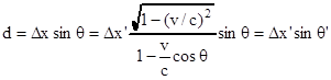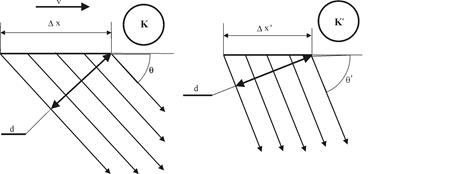 Величина d это толщина светового луча. Она сохраняется постоянной в любой инерциальной системе отсчета. Если учесть, что ширина этого луча не зависит от выбора инерциальной системы отсчета, можно сформулировать закон "преломления" света при переходе наблюдателя из одной инерциальной системы отсчета в другую. Световой луч "поворачивается" на угол d = q - q' и меняет частоту колебаний.