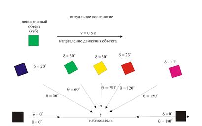 Для полноты картины на рис 5 приведена серия изображений движущегося объекта (куба зеленого цвета), воспринимаемых наблюдателем для нескольких углов наблюдения q.