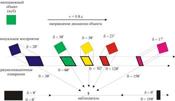 Критики СТО ограничиваются, как правило, анализом эффектов "сокращения" масштабов движущихся тел и "замедлением" времени. К сожалению, они не принимают во внимание, что движущийся объект пролетает мимо них со скоростью v, и наблюдатель вынужден будет рассматривать этот объект под различными углами наблюдения qкак показано на рис.1