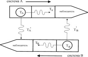 ТА и TВ - интервалы времени, измеренные в собственных ИСО, являющиеся характеристиками сущности; Т'A и Т'B - интервалы времени, наблюдаемые их "чужих" систем (явления).