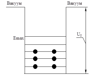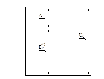 Это навело на мысль рассматривать металл в первом приближении, просто как потенциальную яму, внутри которой (т.е. в металле) потенциальная энергия электрона равна нулю U0=0, а вне металла, т.е. в вакууме U>0. Эта упрощенная модель позволила объяснить многие явления.