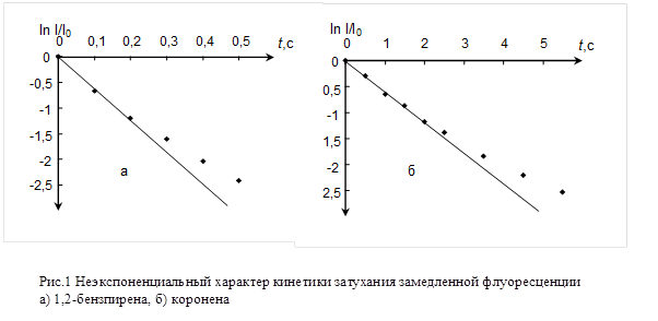 Исследована кинетика затухания замедленной флуоресценции 1,2-бензпирена в додекане и коронена в н.-октане при 77 К. Концентрация 1,2-бензпирена и коронена равнялась 10-4 моль/л. Додекан является «неудобным» растворителем для 1,2-бензпирена, поэтому спектр замедленной флуоресценции представляет собой полосы с разрешенной колебательной структурой, за который ответственны молекулы, вытесненные на поверхность кристалликов. Н.-октан является «удобным» растворителем для коронена, в котором молекулы внедрены в матрицу, и поэтому его спектр является тонкоструктурным [8].