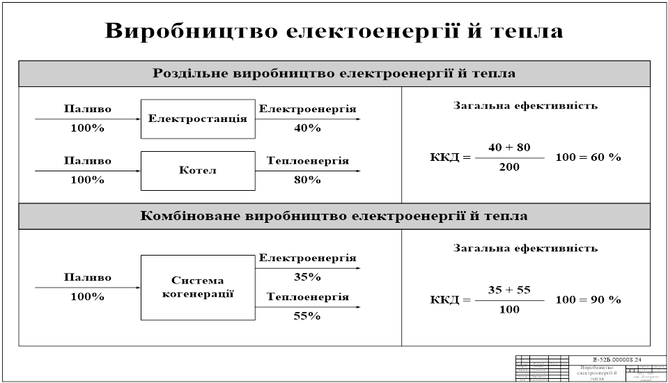 На 1 плакате показано сравнение раздельного и комбинированного производства електроенергии и тепла.