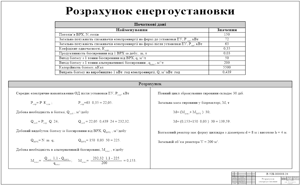На плакате 4 представлен расчет энергоустановки, которая проектируется на небольшом фермермерском хозяйстве в Харьковской области. На ферме находится 150 голов крупного рогатого скота. Общая мощность потребителей электроэнергии 72 кВт. После внедрения энергоустановки, сумарная мощность потребителей электроэнергии, с учетом собственных нужд установки, снизится до 63 кВт, за счет использования тепловой энергии, которая вырабатывается в когенерационной установке.
