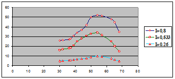 Оказалось, что амплитуда колебаний погруженного в магнитный наноколлоид объекта исследования, возникающих вследствие периодически действующего магнитного поля, зависит от частоты воздействующей силы (частоты переменного магнитного поля). Первоначальное увеличение частоты приводит к увеличению амплитуды, а при некотором значении частоты вынуждающей силы зависимость амплитуды от частоты имеет максимум, характерный для резонансных явлений. Было установлено, что при более высоком значении переменной силы максимум более выражен, кроме того, его крутизна зависит от вязкости жидкости и параметров колеблющегося тела. На рис.5 показаны графики зависимостей амплитуды колебаний ампулы от частоты поля при различных значениях величины импульса тока в намагничивающей системе.