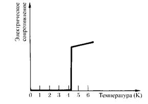 Рис. 5. График зависимости электрического сопротивления от температуры. При температуре ниже критической (здесь это 4, 2 К [абсолютная температура]) электрическое сопротивление полностью отсутствует; выше же этой отметки сопротивление принимает некоторое конечное значение