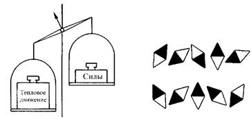 Рис.8. Весы символизируют борьбу между тепловым движением и силами, действующими внутри магнита. Если "перевешивает" тепловое движение, то элементарные магниты оказываются сориентированы в разных направлениях