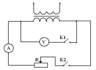 Електросхема складається: з джерела струму, двох котушок знижувального трансформатора, реостата, амперметра, вольтметра, двох вимикачів і 7 з’єднувальних металевих провідників.