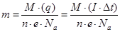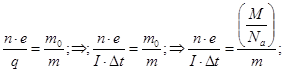 При доторканні одного іона до електрода передається заряд (n·e) між іоном і електродом, іон перетворюється на нейтральний атом масою (m0), який потім осідає на електроді. Отже, при проходженні через розчин заряду (q), на електроді осідають атоми, загальною масою (m). Маємо звичайну пропорцію, яку поступово модернізуємо: