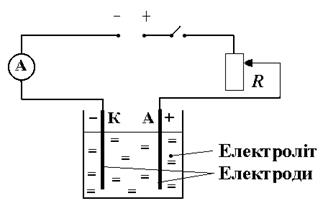 Металеві провідники, що занурені у електроліт називають електродами. Електрод, на який від джерела струму подається негативний потенціал, називається катодом, а якщо подається позитивний потенціал – анодом.