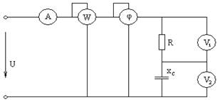 U = Umsin ωt промышленной частоты f = 50 Гц включены резистор и конденсатор. Определить показания приборов, реактивную и полную мощность цепи. Построить треугольник напряжений и векторную диаграмму напряжений.