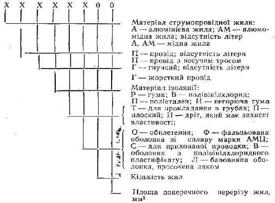 6. В умовному позначенні установочних проводів їх конструктивні елементи можуть зустрічатися в різних комбінаціях, але більшість проводів мають таку структуру позначення: