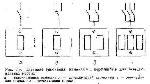 Вимикачі та перемикачі для освітлювальних мереж виготовляють стосовно відкритої і прихованої електропроводок. Останнім часом для нормальних умов експлуатації здебільшого їх випускають у клавішному виконанні (рис. 1), причому розміри клавіш у деяких випадках можуть досягати майже розмірів декоративної кришки. Для зручності користування клавіші вимикачів іноді покривають люмінофором, щоб вони світилися в темноті.
