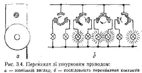Перемикачі зі шнурковими приводами використовують для відкритої електропроводки. Конструкція перемикача дає змогу почергово перемикати, різні кола і таким чином вмикати різну кількість ламп (рис. 2).