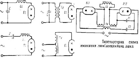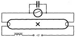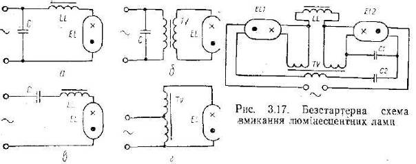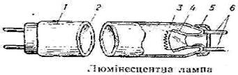 Люмінесцентна лампа складається з циліндричного скляного балона, наповненого парою металу або газу (рис. 3). На торцях циліндричного балона розміщено вольфрамові катоди, по яких пропускають струм розжарювання. Для запалювання лампи призначений пускорегулювальний апарат (ПРА), який формує імпульс напруги, що перевищує імпульс запалювання.